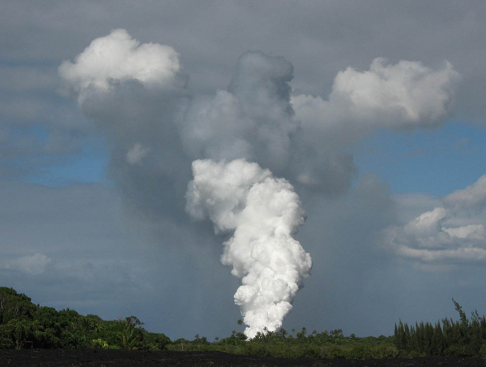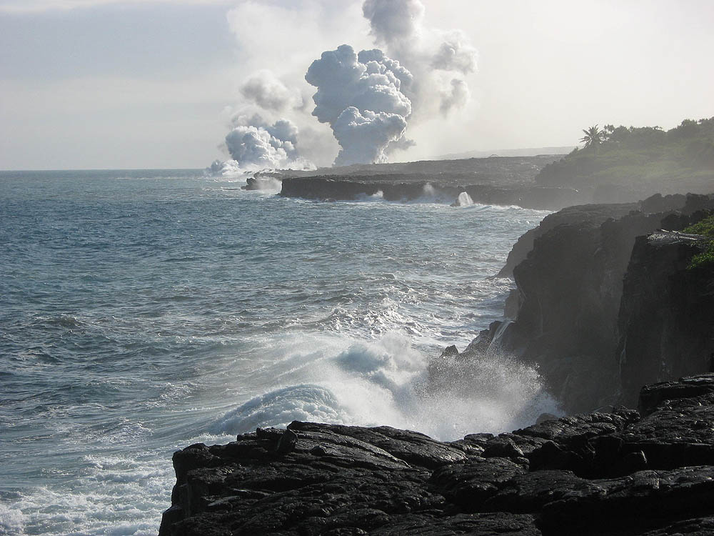 Steam plumes from multiple points where molten lava meets the sea, the usual