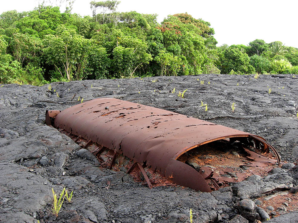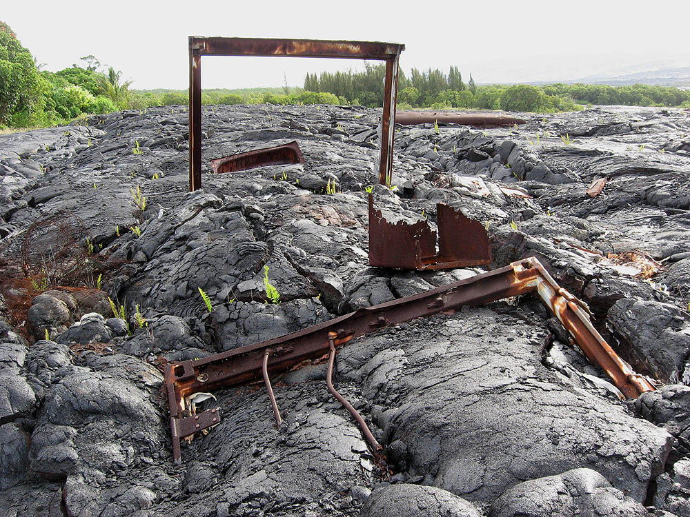 This is the remains of an old school bus that was parked here before the lava