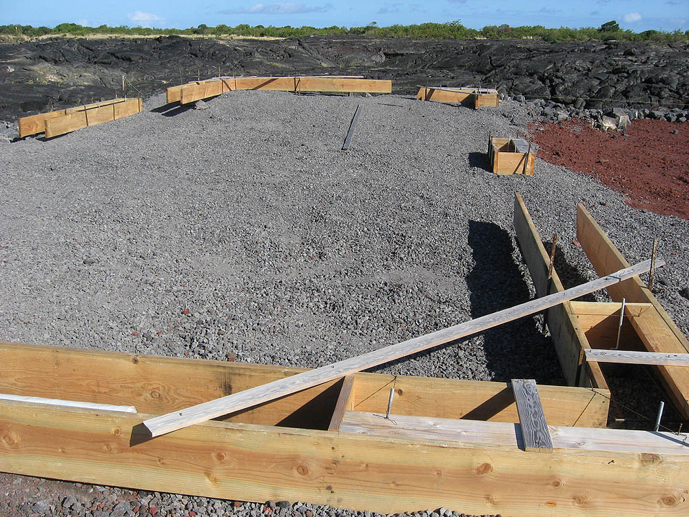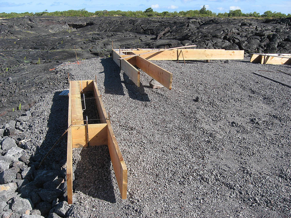 Concrete forms for house foundation, looking south. The area is 24' X 48'. Carport