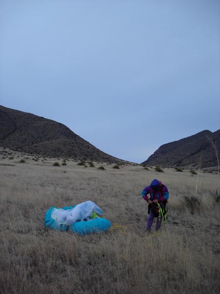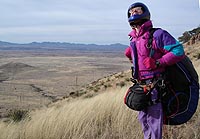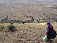 Morey repositions his wing while Allan waits for wind to straighten